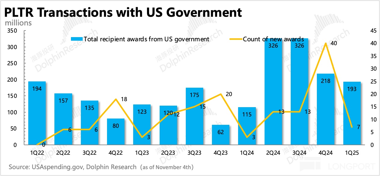 1. 政府效率年的影响还未体现:一季度美国政府收入同比增长 45%,相比四季度小幅扩张,算是略微打消了财报前部分资金对政府收入增长的担忧。政府收支官方网站上,一季度 Palantir 被授予的合同规模确实增速环比下降,但从往年情况来看,短期季节间的波动并不能说明什么。