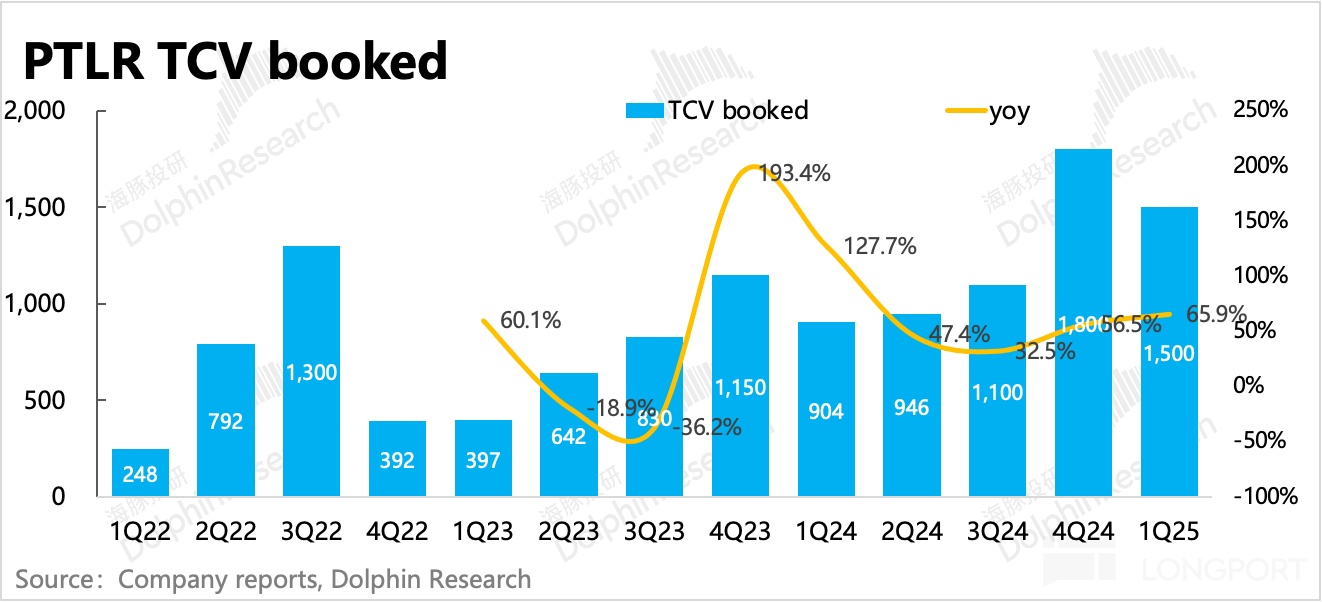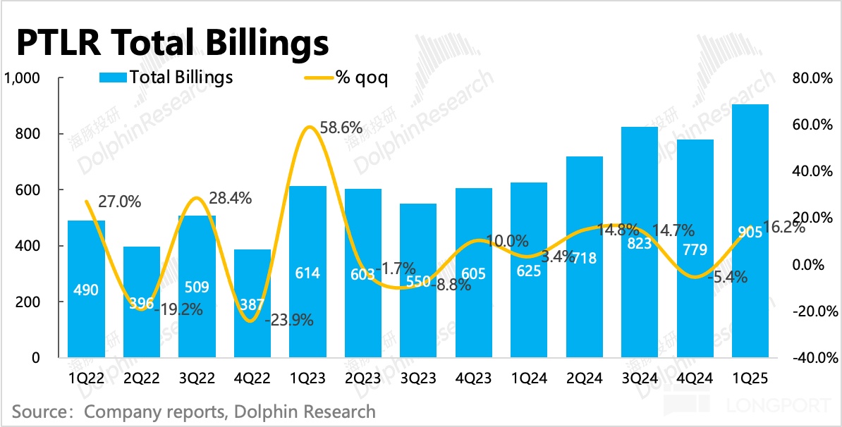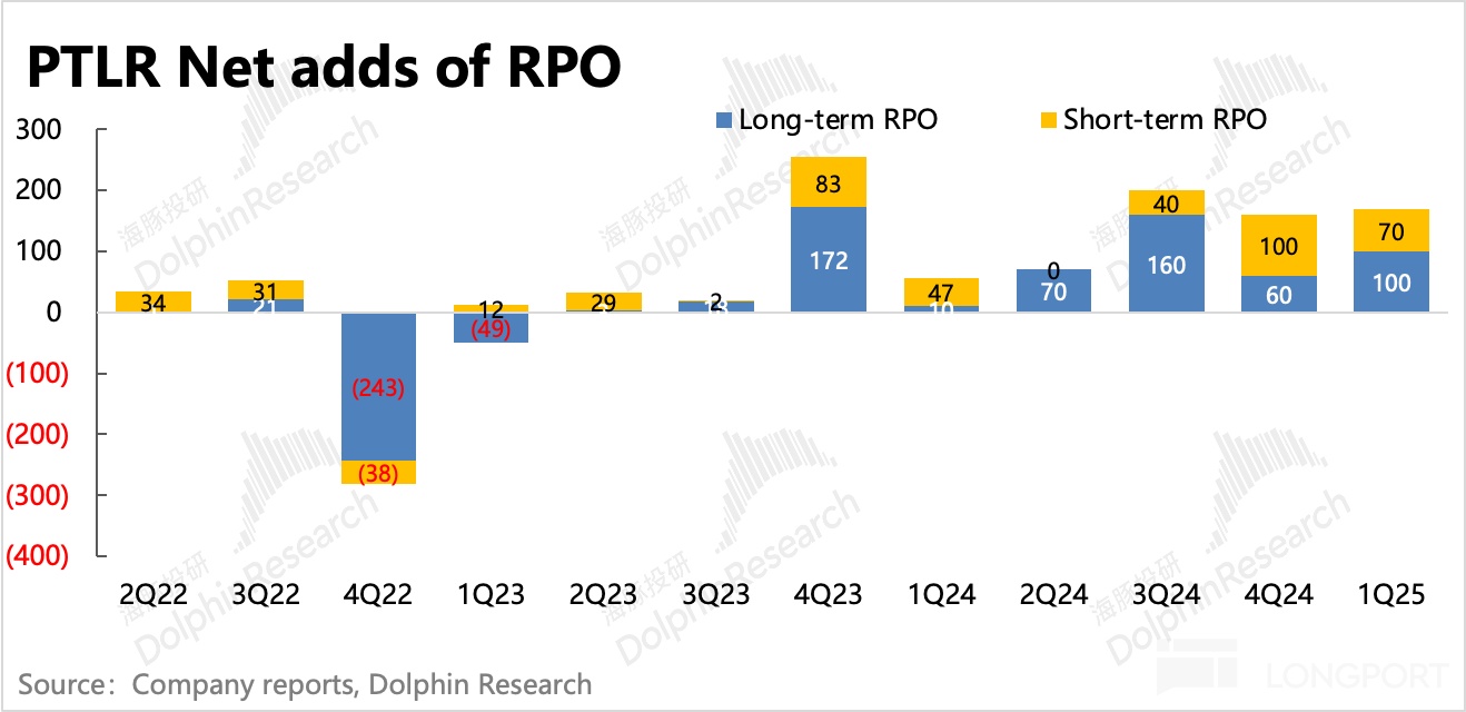 一季度 Palantir 剩余合同额 19 亿美元,环比增加了 1.7 亿,和上季度净增加幅度持平。其中,上季度增长疲软的长期合同,一季度有所恢复,季节间的波动不改长期趋势。