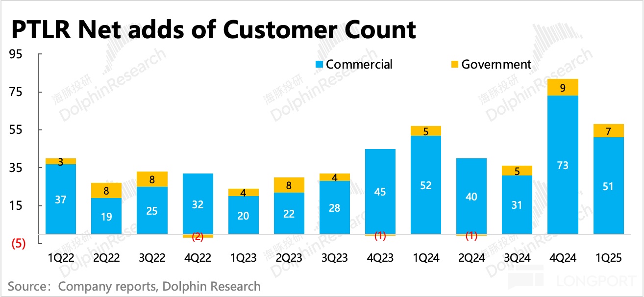 而从最直观的客户数,也偏中长期指标,一季度环比净增 58 家,其中 51 家来自于商业客户,50 家来自美国。剩余净增的 7 家来自政府机构。