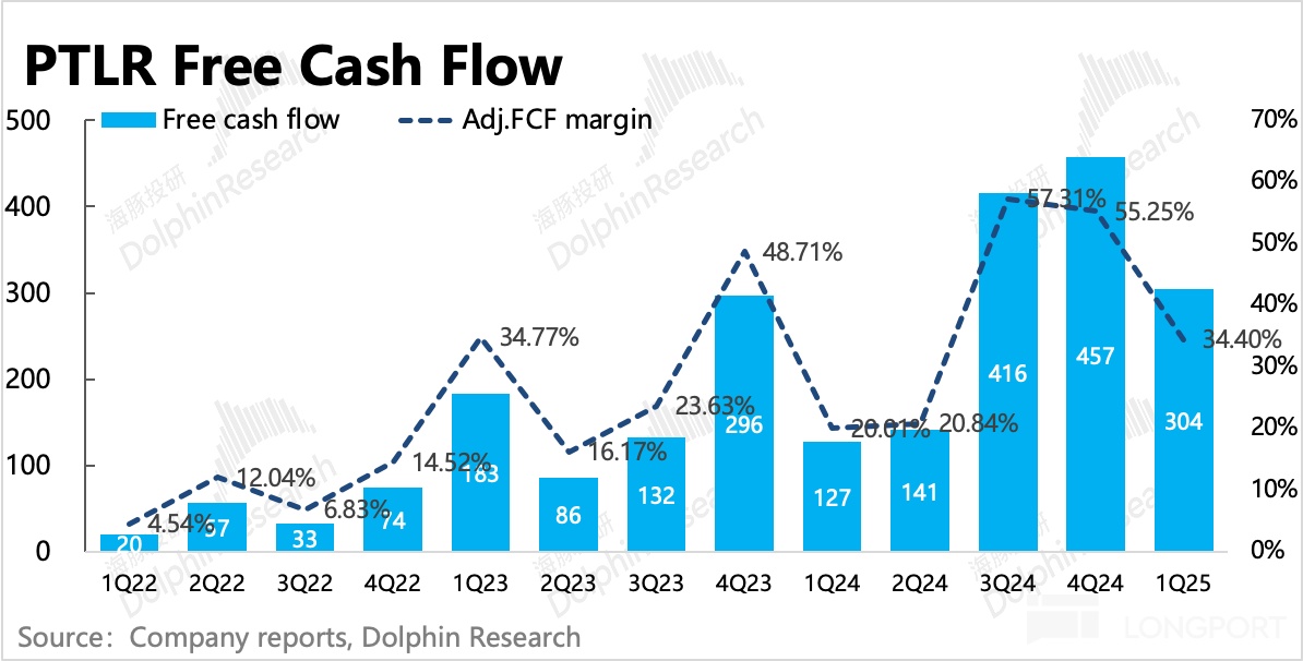 Palantir 的现金流与合同打款有关,因此会出现季节间的波动。一般而言,四季度可能涉及到年度确认时点,短期现金流表现会更好。
