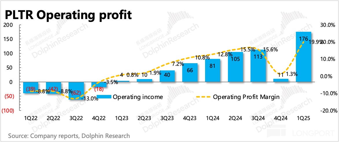 但国防部长后面还有半句话:集中投资高 ROI 领域。而 Palantir 所在的 AI、数据分析领域正是高 ROI 的科技领域之一,因此就算整体预算要削减,海豚君认为,分拨给 Palantir 的预算可能并未减少。