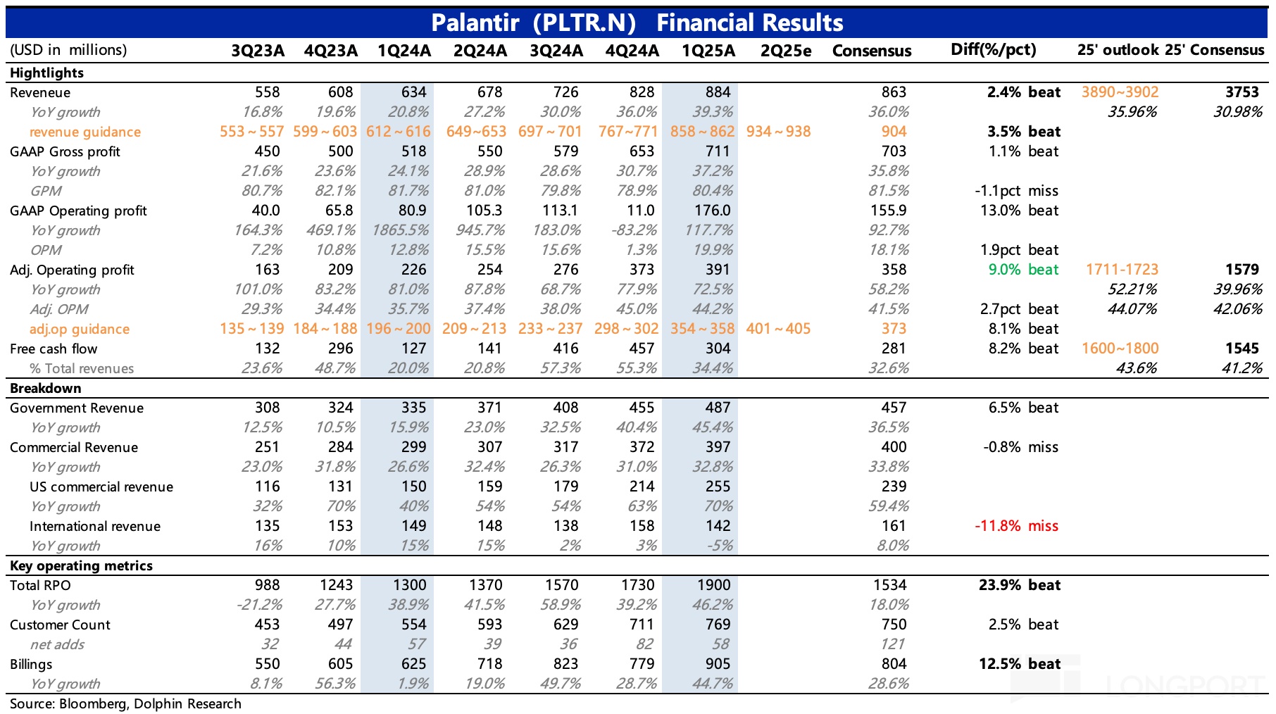 $Palantir Tech(PLTR.US) 于美东时间 5 月 5 日盘后发布了 2025 年一季度的业绩。整体来看,一季度业绩超预期,虽然不如上季度惊艳,但短中期的高增长趋势并未打破,二季度指引以及全年指引均优于机构预期。