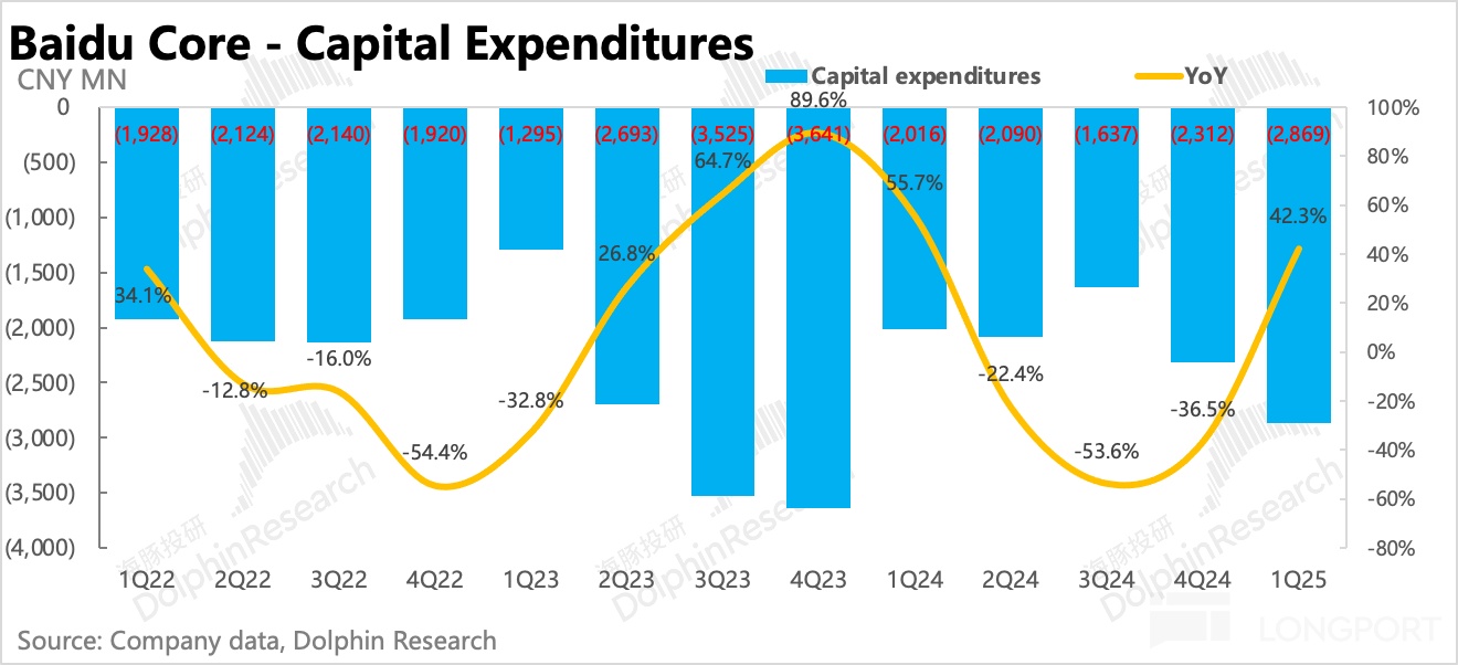 从资本开支上看百度对 AI 服务器、芯片的投入,一季度资本开支正式重启扩张,上季度环比增加,就已经存在扩张迹象。虽然不排除有芯片限购下的提前抢买来拉动,但 DeepSeek 带来革命性的大模型新研发路线,大幅降低了企业试错成本后,显然还是刺激了一波需求。这也使得上游的 “铲子商” 也增加投入扩大供给。