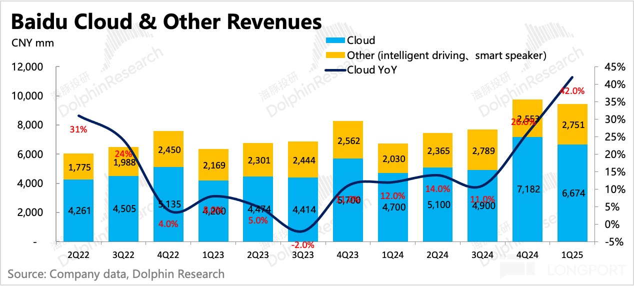 百度核心的其他业务(非广告业务)中,近 70% 的收入来自智慧云,剩余的 30% 主要是自动驾驶技术方案、智能音箱等收入。四季度其他业务收入 94 亿,同比增长 40%,相比上季度明显加速。其中智慧云在 DeepSeek 下,增速飚至 42%,远超市场预期的增速 25%。
