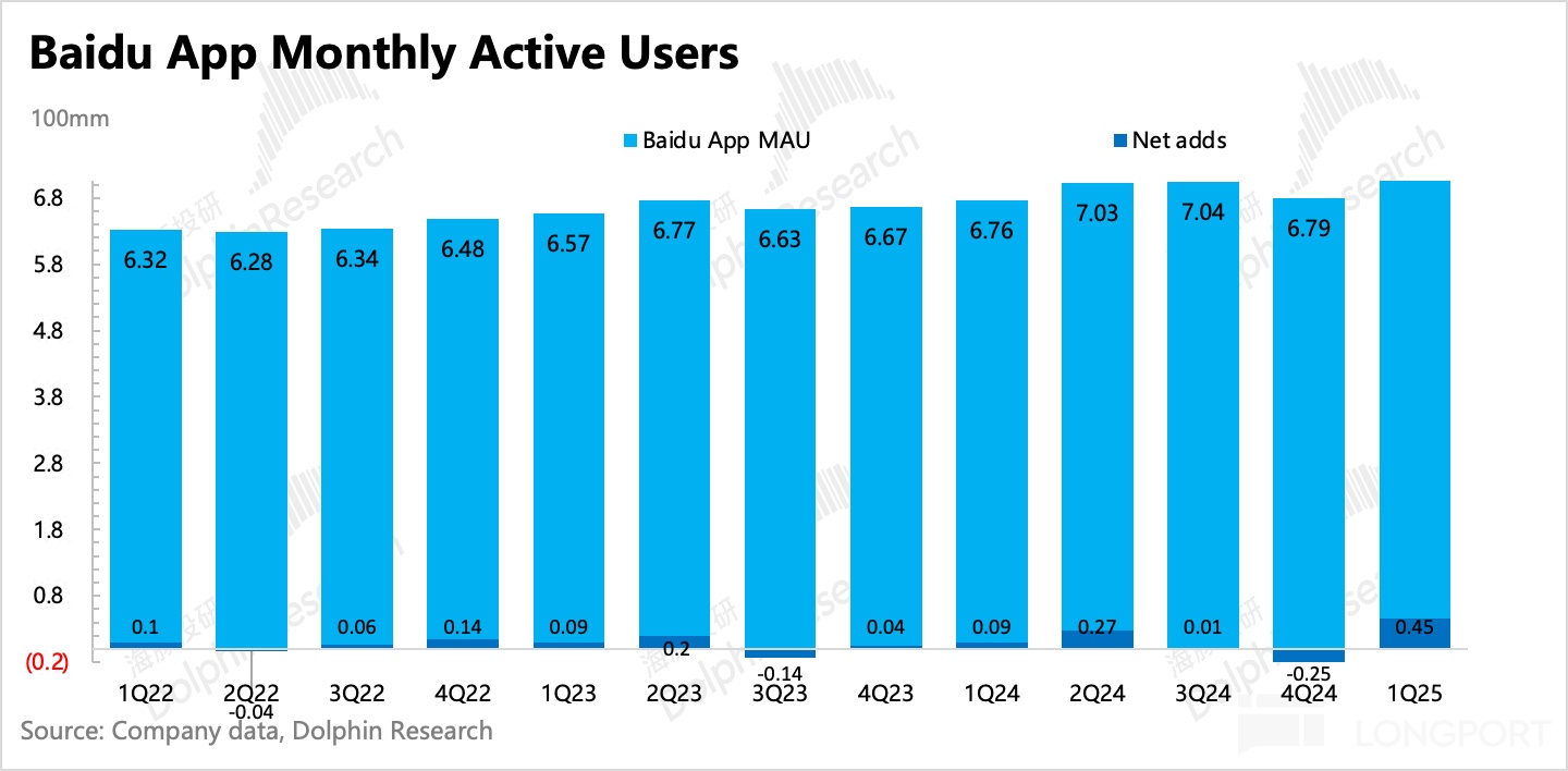 关于生态场景被侵蚀的问题,一季度手百流量在 DeepSeek 助攻下,显著回暖,净回流 4500 万用户。但这里存在的另一个问题是,新增的流量显然粘性主要在 AI 搜索页面,这使得传统搜索广告无法直接受益流量的回暖。
