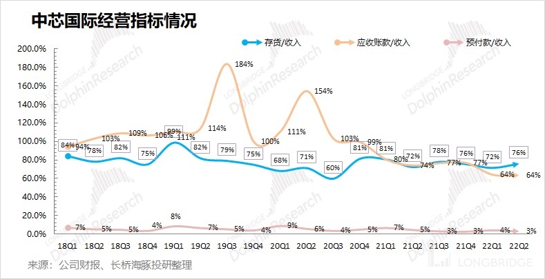 ③结合资产负债表中存货&应收账款和收入之间的关系,本季度存货/收入和应收账款/收入分别为 76.1% 和 63.6%。从营运指标的角度看,中芯国际的存货从去年下半年以来有明显提升,年初至今已经增长 21.36%。