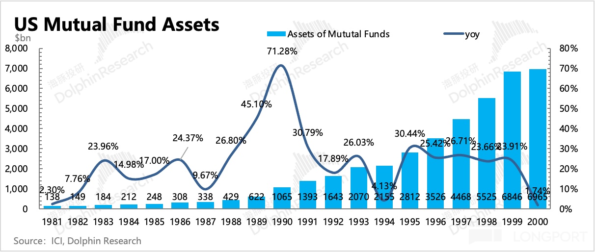 光看1990年至2000年的十年光景里,共同基金规模就增长了5倍,其中1987年股灾之后的修复期增速最猛。