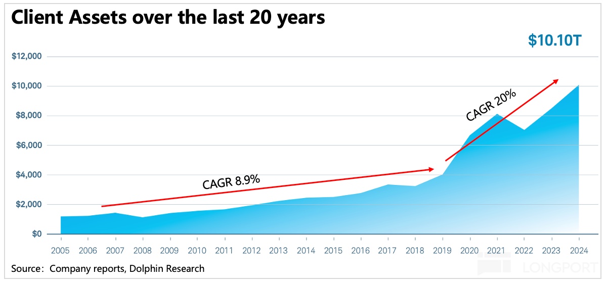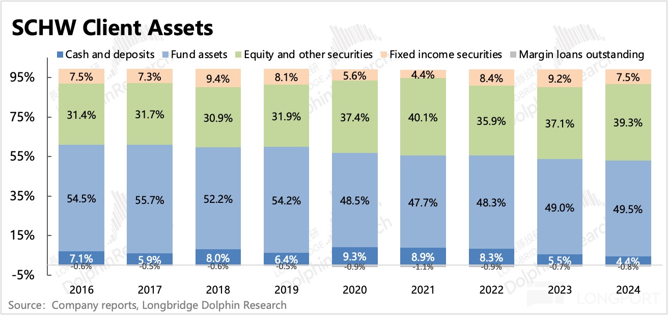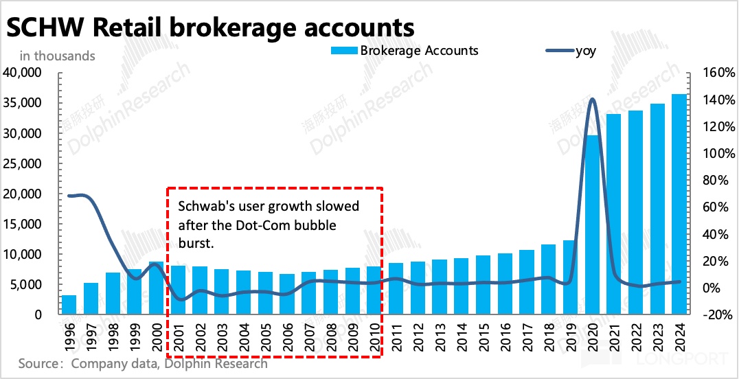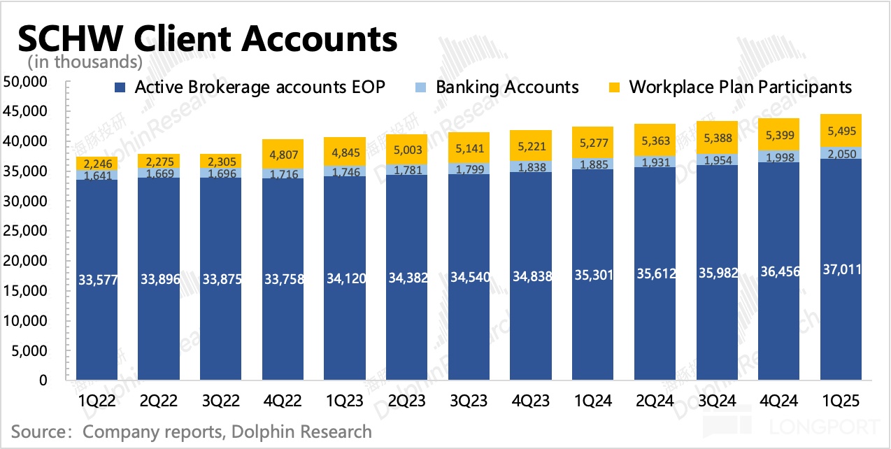 2024年末,嘉信拥有3600万的经纪账户,剔除大约65万个国际账户,最多情况下等于覆盖了美国3.5亿人10%的渗透率(实际同一用户可开多个账户)。