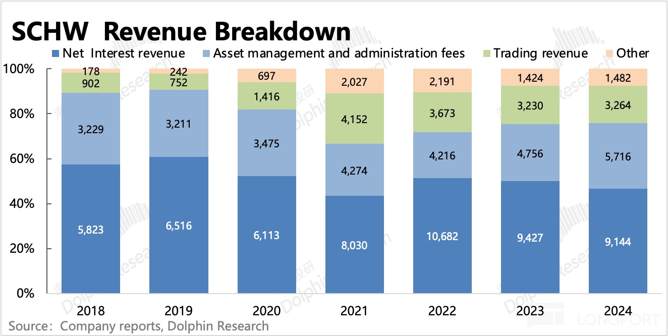 目前净利息收入是当下嘉信创收的第一支柱,包括公司存款利息、银行信贷利息、保证金交易利息、持有债券利息和收益,以及用户融资交易下隔离账户的利息收入,再扣除一定的资本成本。