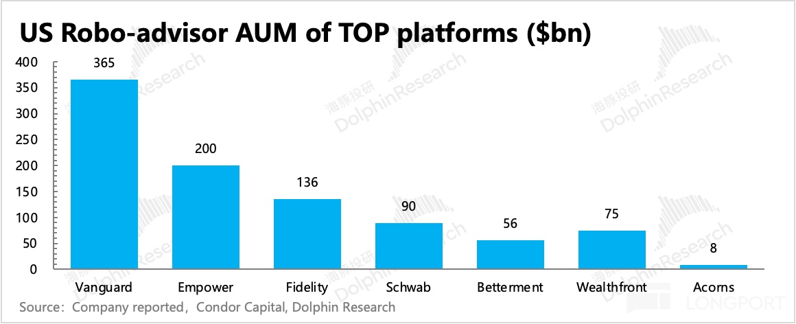 被动指数基金ETFs同样诞生于上世纪90年代,最早靠更低的管理费吸引用户(是同期主动管理基金的1/4,部分宽基费用甚至下降了90%),但长期的关键驱动还是技术,以及美股长牛的大环境。2015年智能投资技术成熟,相关产品兴起,这种自动化投资的低门槛、低费率投资品种,快速渗透到更多投资者。