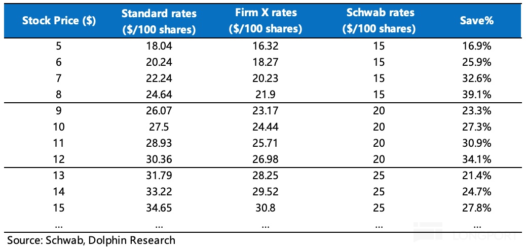 而同期的嘉信,面向散户提供了比传统券商明显更低的折扣(两者最高折价差距可能达到70%以上)。下图为80年代嘉信的佣金宣传单,表明不同股价下每交易100股,标准佣金、X公司(同行对标)提供的折扣佣金以及嘉信提供的折扣佣金对比。