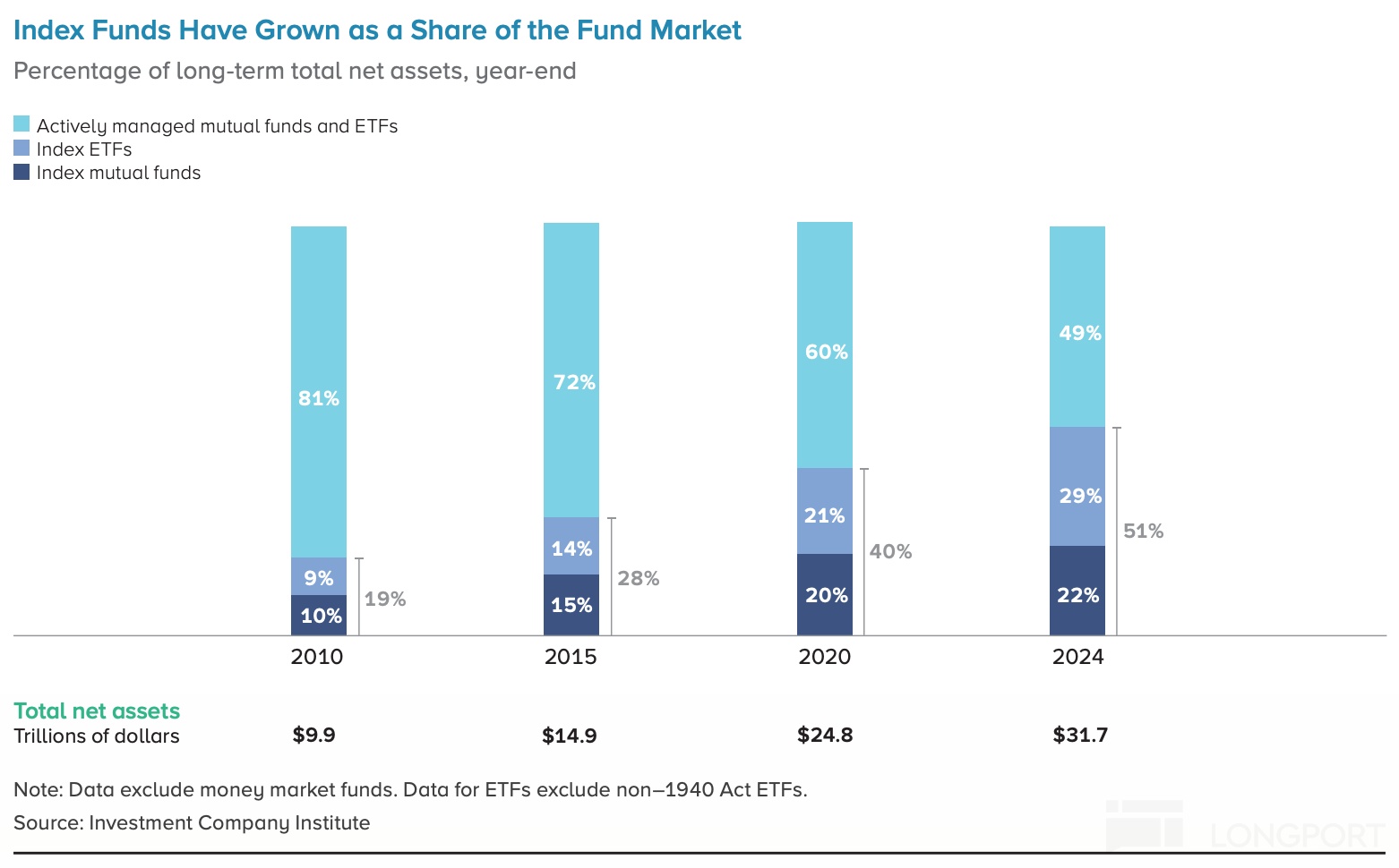 被动指数基金ETF除了早期靠“性价比”优势一炮打响外,伴随着养老金入市、在2010年之后的智能投资热潮,以及美股本身的长牛环境下持续高歌猛进,从1990年增长至今11万亿的规模,多年的CAGR增速超20%。其中费用最低的被动指数ETF基金在整个基金资产池中占到30%。