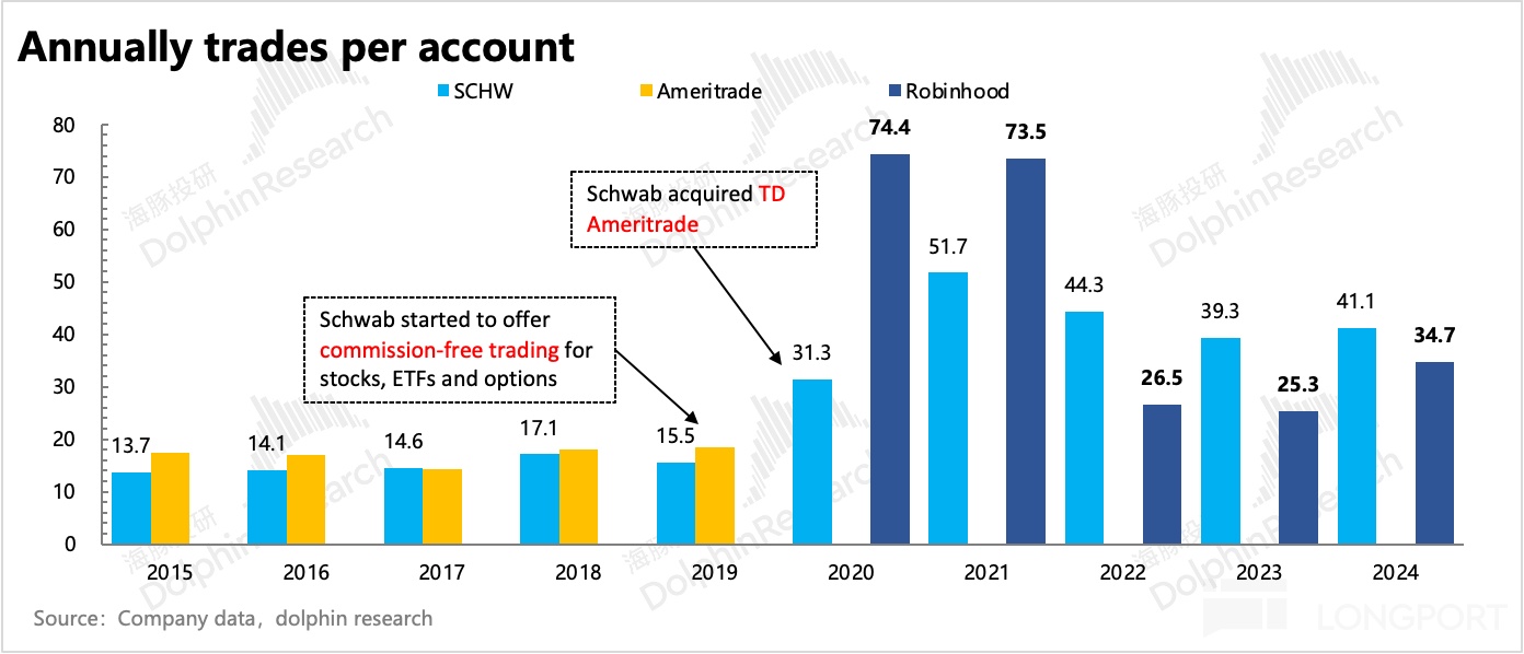 就如同嘉信在2020年收购的Ameritrade,由于更偏交易型定位,Ameritrade用户一般会将个人财富的30%放在Ameritrade。但对于嘉信用户来说,他会倾向于将自己一半以上的财富放在嘉信上。