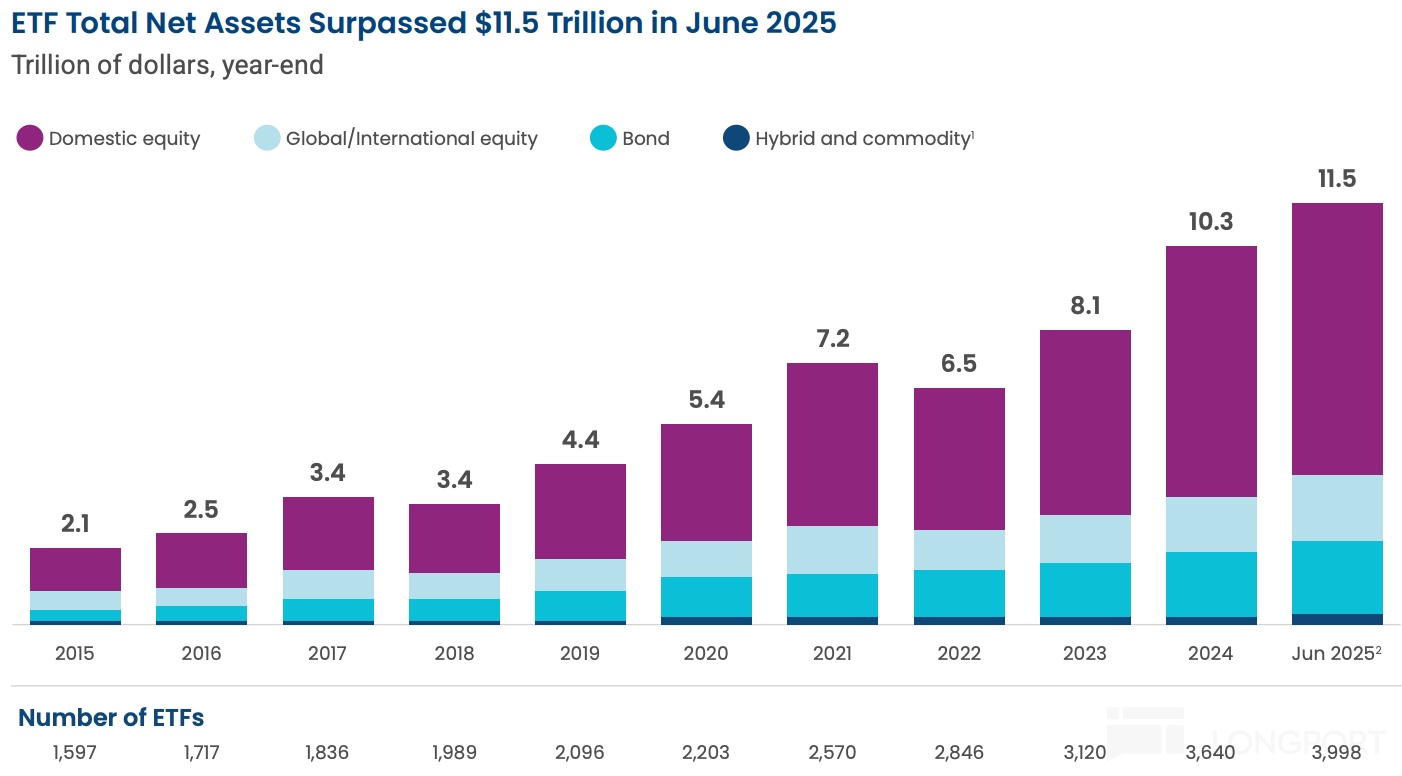 供需相互促进下,整个财富管理行业井喷式发展,除却股灾时期,保持增长近40年至今。在这过程中关键里程碑——共同基金、ETFs的权重持续攀升: