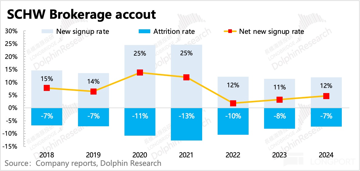 那么嘉信是如何一步步“套牢”婴儿潮一代用户的?又是如何成功破圈俘获X世代青睐的?哪怕看现在,尽管面对疫情前后,零佣金兴起下的激烈竞争,发展也已经熟透了的嘉信,正常情况下经纪账户年流失率也能基本保持在7-8%相对较低的水平。