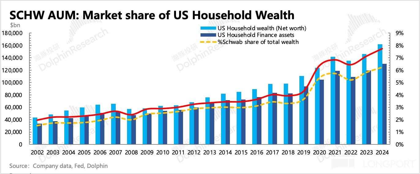 2024年末,嘉信托管的客户总资产规模近10万亿美元,99%是美国用户资产(2024年投资者日会议:国际用户资产规模920亿美元)。这个规模体量,位居行业前列。过去二十年,放在全民超160万亿的财富大盘中,嘉信市占率一路水涨船高已经超过6%,如果只看金融资产的范畴(财富资产中剔除房屋、商业资产),那么嘉信平台上的金融资产规模,占到市场的8%。