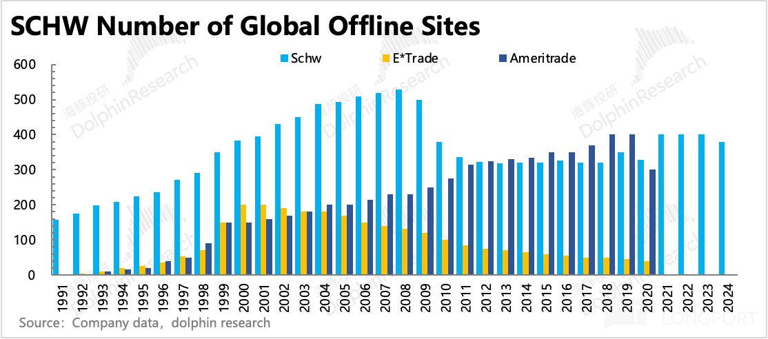 为了增强与客户之间的信任关系、满足部分年老用户的人工客服下单需求,哪怕身处互联网洪流,最先推出在线交易网站Schwab.com,嘉信也坚持在业务发展的同时开设线下网点: