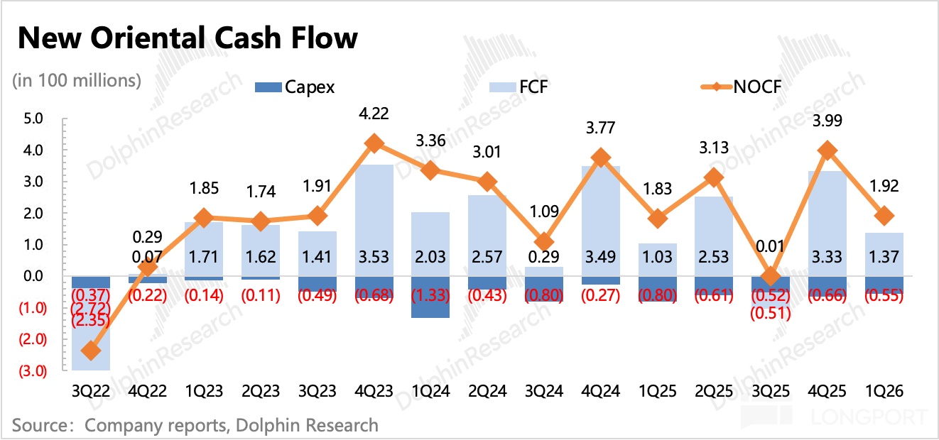 新东方虽然只是一个不到百亿的公司,但因为商业模式对现金流友好以及多年的积累,账上现金并不少。截至 2025 年 8 月末,还有 29 亿美金(剔除预收学费),走出双减阵痛后的自由现金流已经回到正数。因此只要管理层 “大方” 态度持续,这个股东回报还是有能力保持的。