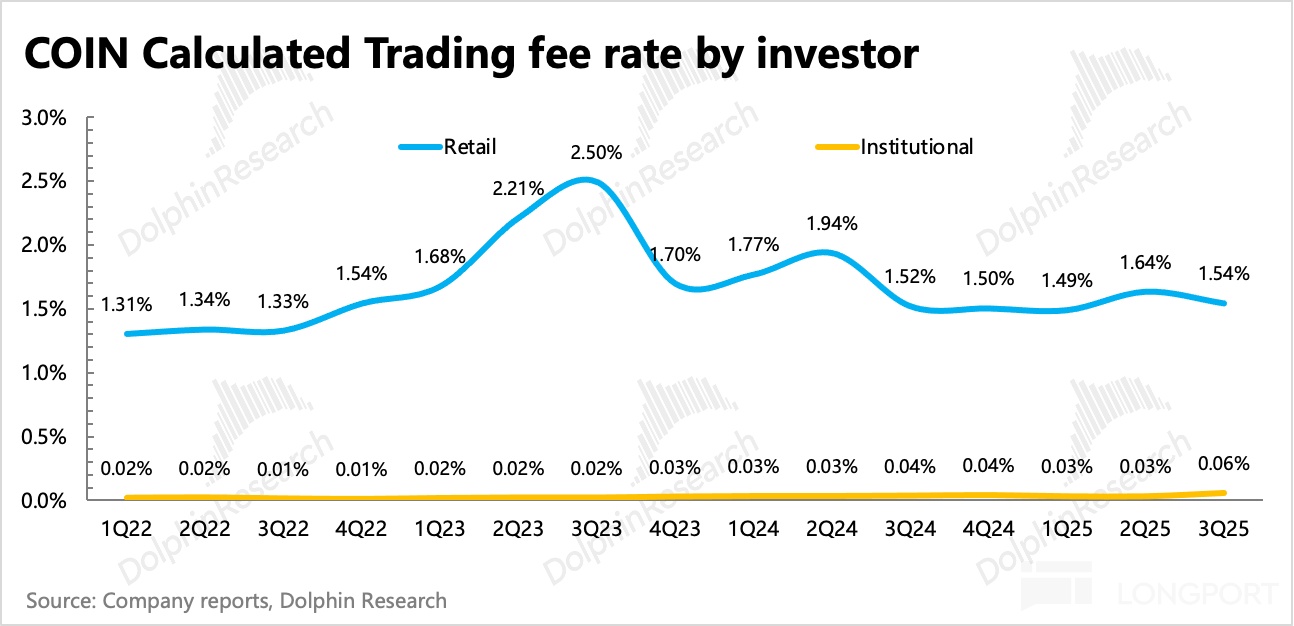 随着衍生品未来渗透占比逐步走高,也能对冲综合费率的下降趋势。三季度没了二季度的临时突发交易需求,即高费率的 Simple 通道的交易减少,散户费率恢复往下。机构费率有所抬高,可能是因为大量衍生品交易的使用。