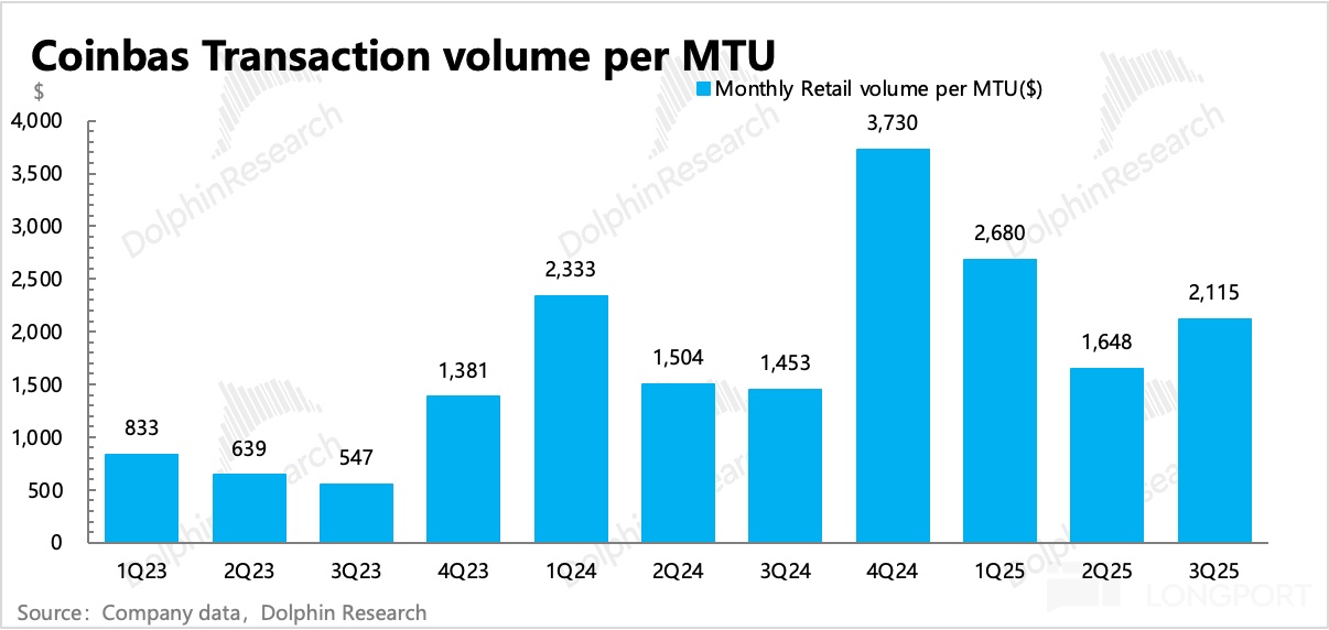 三季度交易用户净增 60 万人,恢复到 930 万,但只能数小幅修复。尽管加密资产市值在三季度创新高,但 Coinbase 的活跃交易用户数还没回到 Q1 水平、人均交易量同样还有距离。