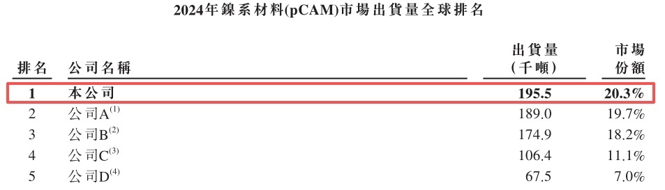 在镍系材料 (pCAM) 市场,本公司于 2020 年至 2024 年连续五年以出货量计排名全球第一,于 2024 年的市场份额为 20.3%。全球镍系材料 (pCAM) 市场集中,以 2024 年的出货量计算,全球前五大制造商占总市场份额的 76.3%。