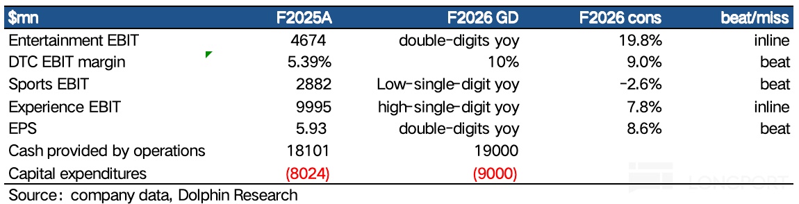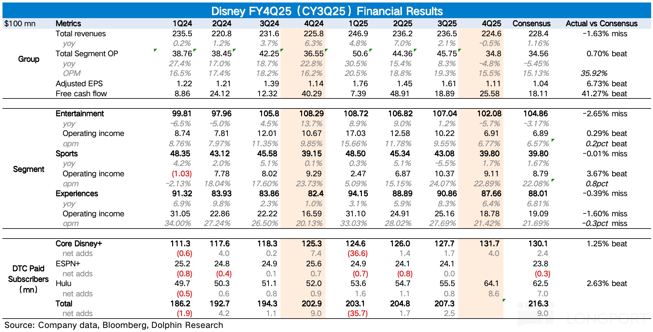 $迪士尼(DIS.US) 美东时间 11 月 12 日美股盘前发布了 2025 财年第四季度(CY25Q3)业绩。三季度业绩表现整体看小幅不及预期,收入承压,尤其是业绩贡献最大的主题公园,滞后的竞争影响还是显现了。虽然公司盈利略优,并坚持此前相对积极的 2026 年指引不做调整,但市场似乎信心不足。