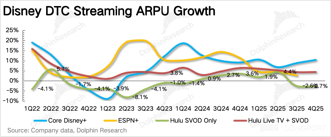 1. DTC 净增用户反弹超预期:四季度流媒体用户增长继续反弹,其中 Disney+ 净增 400 万人(捆绑套餐),Hulu 增加 860 万(Charter 合作恢复、品牌全球化等驱动),均超出市场预期。增长拉动主要受益优质内容,以及 Hulu 的全球化、内部流媒体的统一捆绑,新增用户中 80% 选择了 Disney+、Hulu 和 ESPN 的三合一套餐。
