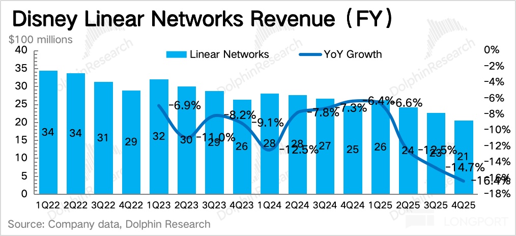 作为跷跷板的两端,流媒体发展火热的同时,传统媒体的老业务自然不能独善其身。随着传统媒体趋势性衰败,流媒体对迪士尼来说不能算是完全意义上的增量了,而有很大一部分是在弥补传统渠道的没落。