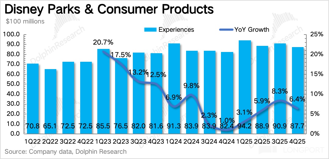 不过,公司目前官方的下一季度预定量增速也还是放缓至 3%。按此趋势,预计一季度公园基础业务可能还是会面临下滑,两只新运营的游轮收入在当期的贡献并不完全,游轮业务是 2026 财年体验业务的主要增长线。但前置投入成本和运维成本也需要先确认摊销进来,因此下季度收入、利润都还有压力。