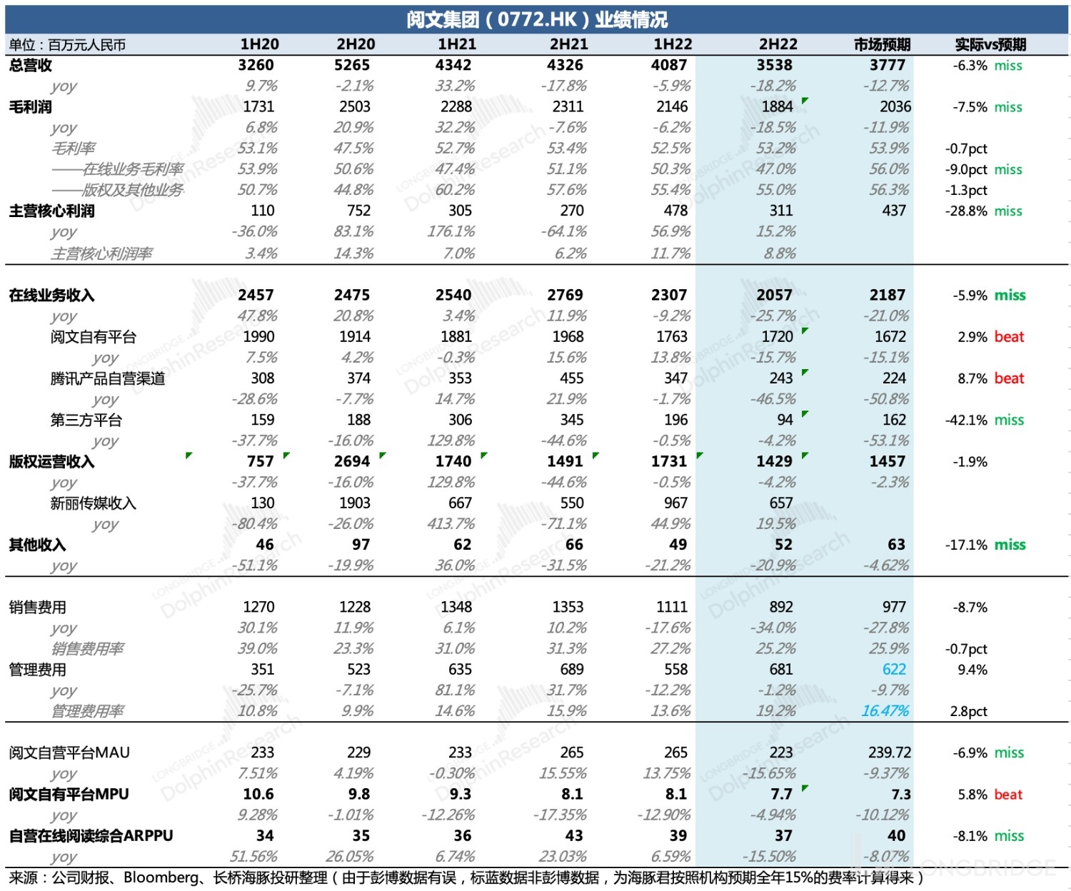 下半年阅文自营平台的月活人数有所下滑,公司解释为降本增效策略下,减少了获客投放。腾讯系渠道(微信阅读、腾讯视频等)的在线阅读用户下半年也有了一定流失,但全年维度来看基本保持稳定。