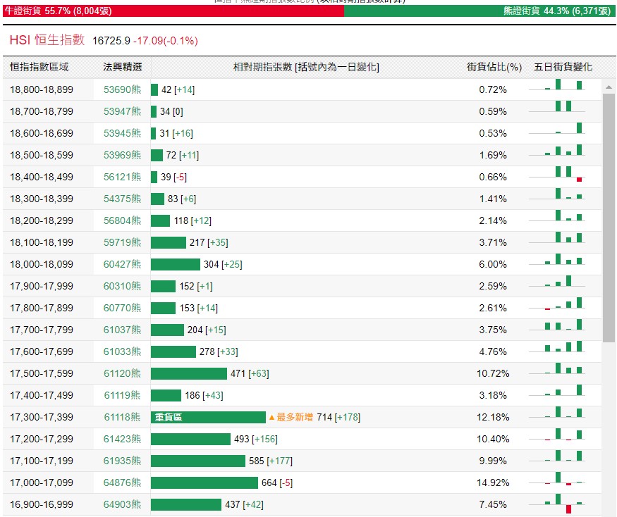 As of February 24th, the latest bull-bear ratio of the Hang Seng Index is 56:44. According to the data from the Societe Generale Hang Seng Index Bull-Bear Certificate Street Cargo Distribution Chart, the heavy bearish cargo and the highest number of new additions are in the range of 17300-17399. The latest number of bearish certificates in this range is 714, an increase of 178 from the previous trading day. The heavy bullish cargo and the highest number of new additions are in the range of 16300-16399. The latest number of bullish certificates in this range is 1283, an increase of 909 from the previous trading day.