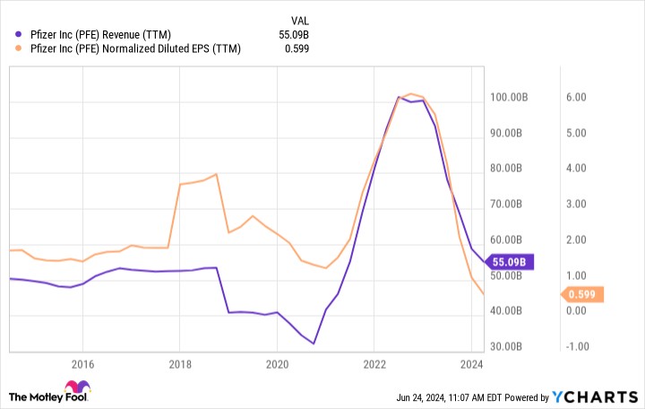 Unfortunately, Pfizer's COVID-19 vaccine (Comirnaty) and treatment (Paxlovid) became over half the business at one point, and unwinding that surge has been painful for the top and bottom lines: