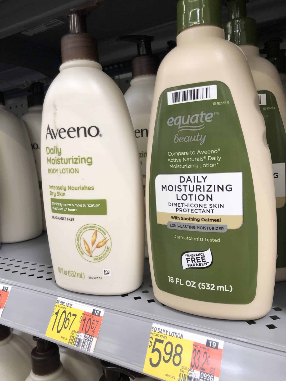 - 價格比較:Equate 日常潤膚乳 45.98 美元/18 盎司 vs. 艾維諾日常潤膚乳 10.67 美元/18 盎司