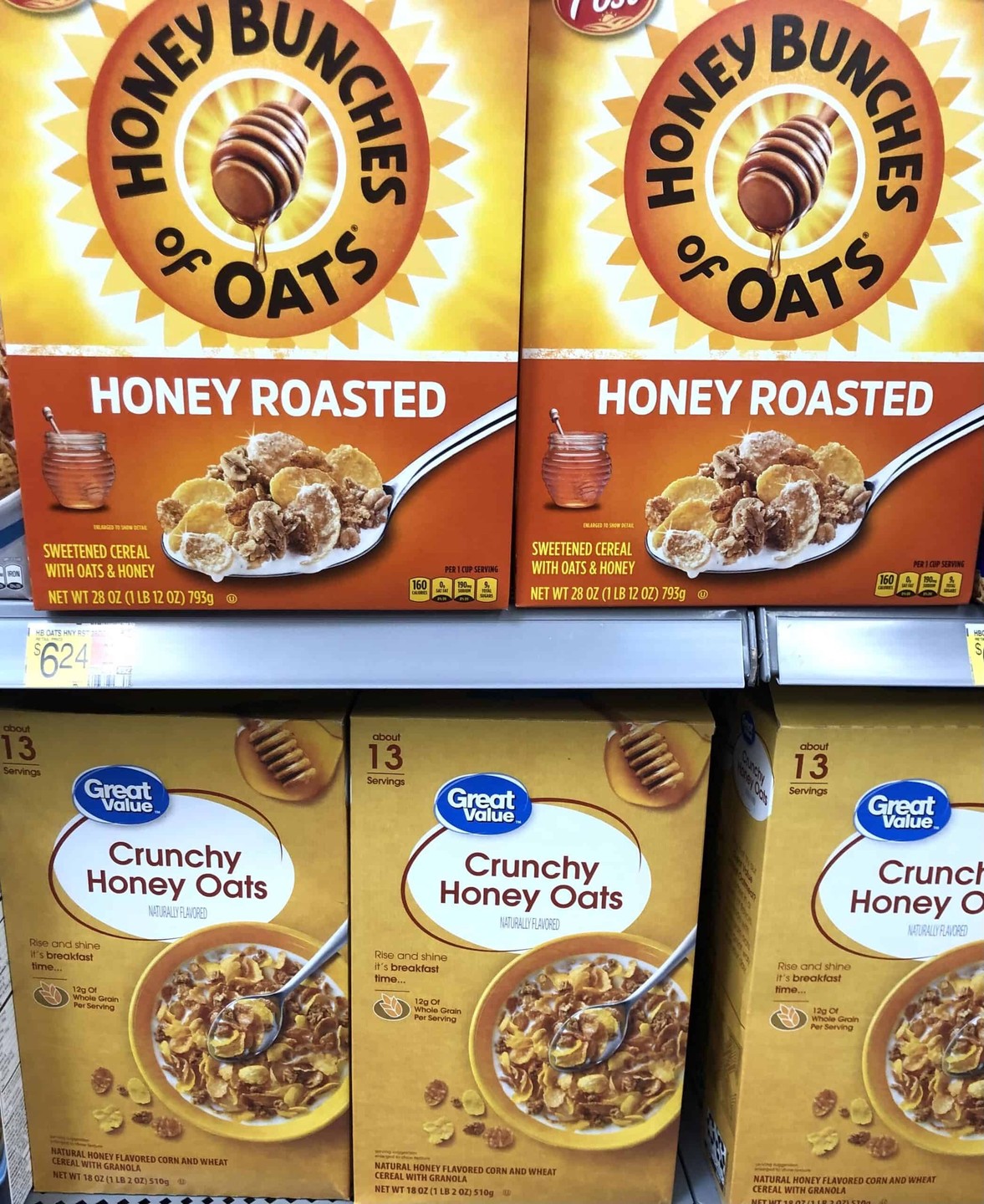 - 價格比較:超值蜂蜜燕麥脆片 3.25 美元/23 盎司 vs. Post 蜂蜜燕麥片 5.40 美元/12 盎司(10.80 美元/24 盎司)