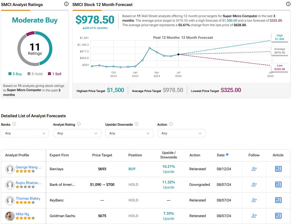 Super Micro Computer is currently rated as a Moderate Buy based on analyst ratings. The stock currently has five Buys, five Holds, and one Sell rating from analysts. The (SMCI), a provider of high-performance computing and AI infrastructure solutions, has seen its stock experience significant volatility. The AI infrastructure company's stock went parabolic in January 2024, only to crash after it joined the S&P 500 (SPX). While a correction was warranted, it’s a bit overextended now, especially with the recent impressive revenue guidance. I am bullish on Super Micro due to its lower price point and promising catalysts. Analyzing the Earnings Report Super Micro closed out Fiscal 2024 with soaring sales and promising guidance for the future. The company delivered $5.31 billion in quarterly revenue compared to $2.18 billion in the same quarter last year, a 143% increase. Additionally, net income increased by 82% year-over-year to reach $353 million. Those results are good, but investors got nervous about narrow profit margins. For context, Super Micro’s net income was $402 million in Q3 FY24, indicating a sequential decline of 12%. Meanwhile, the AI beneficiary reported $3.85 billion in Q3 FY24 revenue, meaning that Q4 revenue saw a 38% sequential increase. Profit margins should continue to narrow in Fiscal 2025, which prompted the excessive sell-off. Not even a 10-for-1 stock split could dissuade investors from rushing for the exits. However, the guidance makes it hard to justify how far the stock has fallen. Super Micro anticipates Fiscal 2025 revenue ranging from $26.0 billion to $30.0 billion, compared to $14.94 billion in Fiscal 2024 revenue. Guidance suggests that revenue can more than double year-over-year (at the high end of the range), especially with Super Micro’s tendency to beat top-line expectations. While the company didn’t offer guidance for net income, it should once again grow year-over-year. The question is, by how much? Regardless, even if net income growth decelerates to 30-50% year-over-year, it still presents a good long-term opportunity. Margins Can Improve Over Time Super Micro Computer remains committed to becoming the world’s largest IT infrastructure company, and it's on pace to achieve that target. With AI tailwinds still booming, Super Micro is offering competitive prices to gain market share. The company is essentially trading higher profits for revenue. This is a short-term problem that CEO Charles Liang expects to be resolved before the end of Fiscal 2025. Current margin issues shouldn’t be a deterrent to long-term investors who intend to hold onto their positions for multiple years. The Valuation Is Key I sang a different tune about Super Micro Computer stock shortly before it joined the S&P 500. In that article, I expressed concerns about profit margins, steady revenue growth rates, and its valuation. Super Micro had a P/E ratio above 80x when I wrote that article, indicating that the stock was priced for perfection. Guidance suggests hyper-growth will continue for at least another year, which makes it easier to feel optimistic about the tock. Profit margins did narrow, but so did the valuation. The stock now trades at a much lower 31.6x P/E ratio, which makes it easier to dismiss smaller profit margins. If Super Micro still traded above an 80x P/E ratio, I would be singing a different tune, but I believe the current valuation presents a good buying opportunity. A Pre-Stock Split Frenzy Can Push Shares Higher Stock splits have been a hit this year. Nvidia (NVDA), Broadcom (AVGO), Chipotle (CMG), and Walmart (WMT) are some of the companies that have generated more demand for their shares due to stock splits. While SMCI’s stock split announcement didn’t do much to stop a 20% drop after earnings, that split can spark momentum as the date gets closer. Super Micro Computer will initiate a 10-for-1 stock split on October 1, 2024. Additionally, if Nvidia reports another strong earnings on August 28, Super Micro's stock could rise alongside it, building momentum as the split date nears, potentially attracting more investor interest. Stock splits do not increase a company’s intrinsic value, but they normally do a good job of attracting new investors. A lower price per share will also increase options trading activity, which can lead to more dramatic price swings for Super Micro. Is Super Micro Computer Stock a Buy, According to Analysts? Super Micro Computer is currently rated as a Moderate Buy with 55.6% in projected upside from current levels. The stock currently has five Buy ratings, five Hold ratings, and one Sell from analysts. The highest price target of $1,500 per share suggests that the stock can gain 138%. See more SMCI analyst ratings The Bottom Line on Super Micro Computer Stock Super Micro Computer is in the right place at the right time as the artificial intelligence industry continues to thrive. Most investors liked the company’s revenue guidance but expressed concerns about declining profit margins. However, leadership expects to resolve profit margin issues by the end of Fiscal 2025. Furthermore, guidance implies that Super Micro can more than double its revenue year-over-year in Fiscal 2025. The relatively low valuation is the icing on the cake for this top-performing AI stock. Investors have started to realize the opportunity, as shares are now up by roughly 30% from their post-earnings drop. Nvidia’s upcoming earnings report and Super Micro’s upcoming stock split can fuel more momentum for the stock. Disclosure">average SMCI stock price target of $978.50 implies 55.6% upside potential. The highest price target of $1,500 per share suggests that the stock can gain 138%.