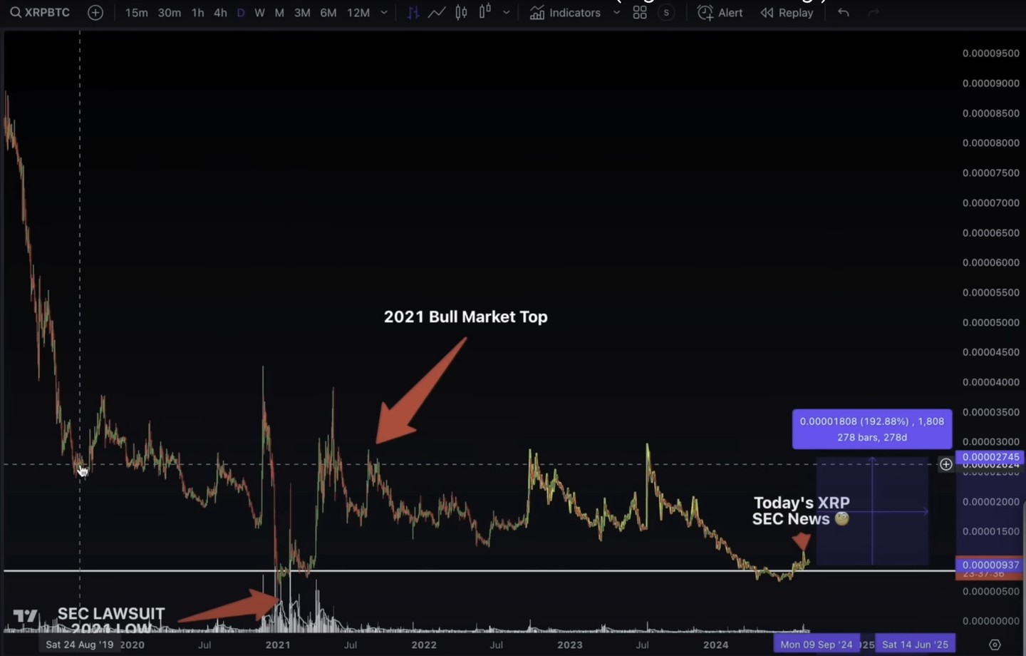 However, the analyst warns that XRP is facing a lot of upside resistance and that it needs to significantly outperform against Bitcoin (XRP/BTC) to reach its historic higher levels.