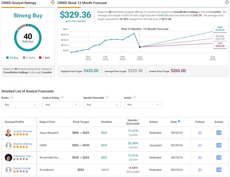 CrowdStrike scores a Strong Buy consensus rating based on 34 Buys, five Holds, and one Sell recommendation. The average CRWD stock price target of $329.36 implies about 19% upside potential. Shares are up 9% so far this year.