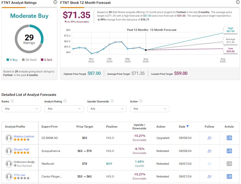 With nine Buys and 20 Holds, Fortinet has a Moderate Buy consensus rating on TipRanks. The average FTNT stock price target of $71.35 implies a possible downside of 7% from current levels.