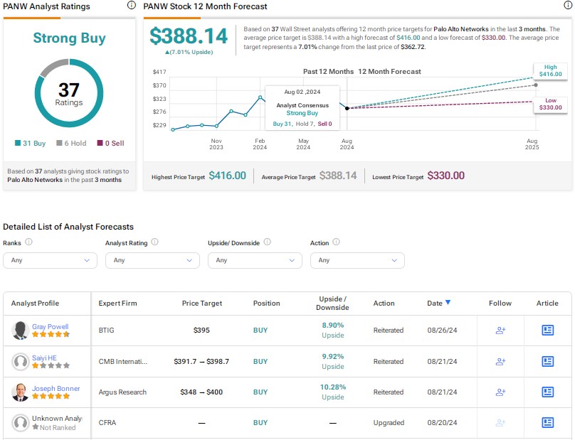 Wall Street has a Strong Buy consensus rating on Palo Alto stock, backed by 31 Buys and six Holds. The average PANW stock price target of $388.14 indicates 7% upside potential. Shares are up 23% year-to-date.