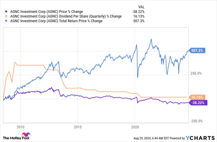 The problem with AGNC Investment is that dividends are an important part of its return profile, noting that the stock has a roughly 14% dividend yield. Only, as the chart above highlights, the dividend has been cut regularly for years. The yield has stayed high because the stock price has tracked the dividend lower. That's a terrible outcome if you spend the dividend income your portfolio generates. This is not an income stock.