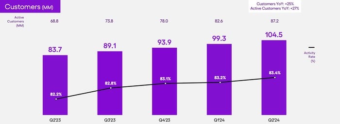 Nu's business model has proven just about ideal. Over the past decade, the company has zoomed from essentially zero customers to more than 100 million. And yet the crazy growth rates continue. Nu added more than 20 million customers last year, with revenue rising 65% year over year. More than half of all Brazilian adults are now Nu customers, and more than 80% of users are considered "active" -- meaning they've used the service sometime over the last month. This activity rate has actually grown over the past year even as Nu has added millions of new customers -- a testament to the company maintaining a high-quality offering of in-demand services.