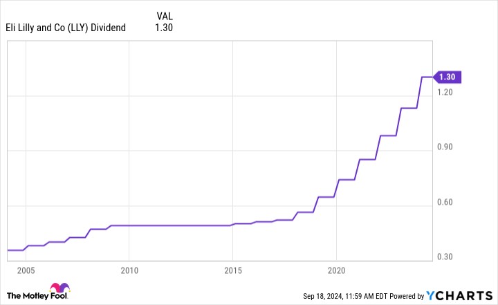 On its corporate website, Eli Lilly's financial records date back to 1972. Back then, Lilly paid a modest quarterly dividend of just $0.01 per share. Today, investors receive quarterly dividend payments of $1.30 (or $5.20 per year) for each share they own.