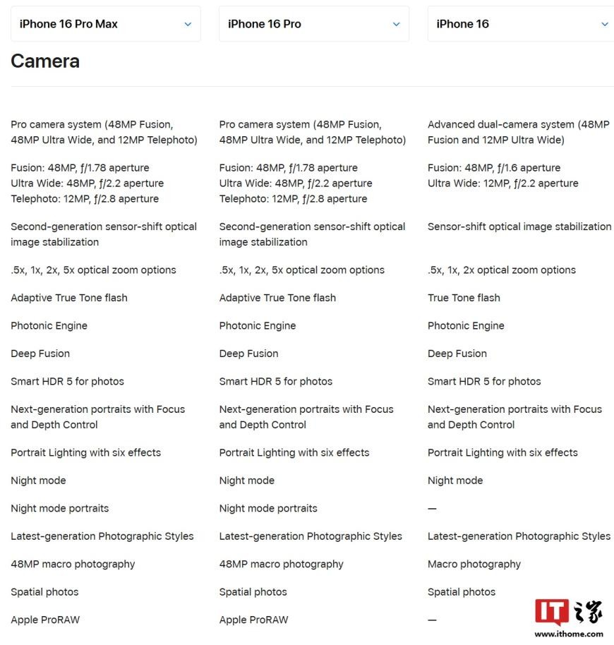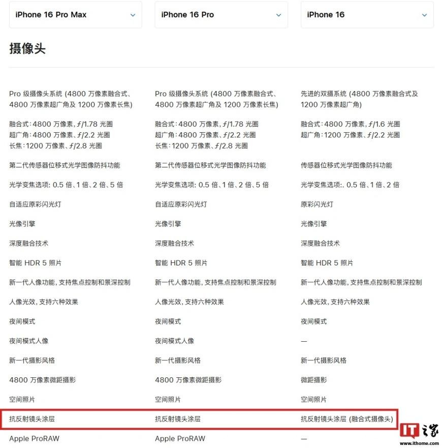 According to IT Home's report on September 10th, Apple's official website previously stated that the iPhone 16 Pro/Pro Max is equipped with "anti-reflective lens coating," while the iPhone 16/16 Plus is equipped with "anti-reflective lens coating (integrated camera)."
