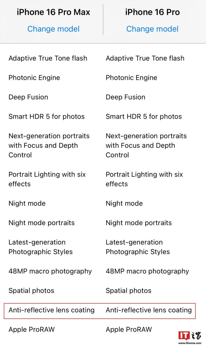 IT Home compared the detailed specifications of the models with Apple's U.S. official website and found no mention of "anti-reflective lens coating."