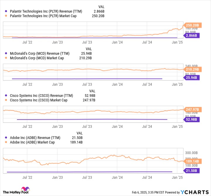 但有時,股票的漲幅快於業務,這可能會導致麻煩。目前,Palantir 的市值約為 2500 億美元。該公司在 2024 年實現了 28.7 億美元的收入。為了給這一點提供一些背景,Palantir 現在的規模超過了一些世界上最知名的企業,包括 麥當勞、思科 和 Adobe: