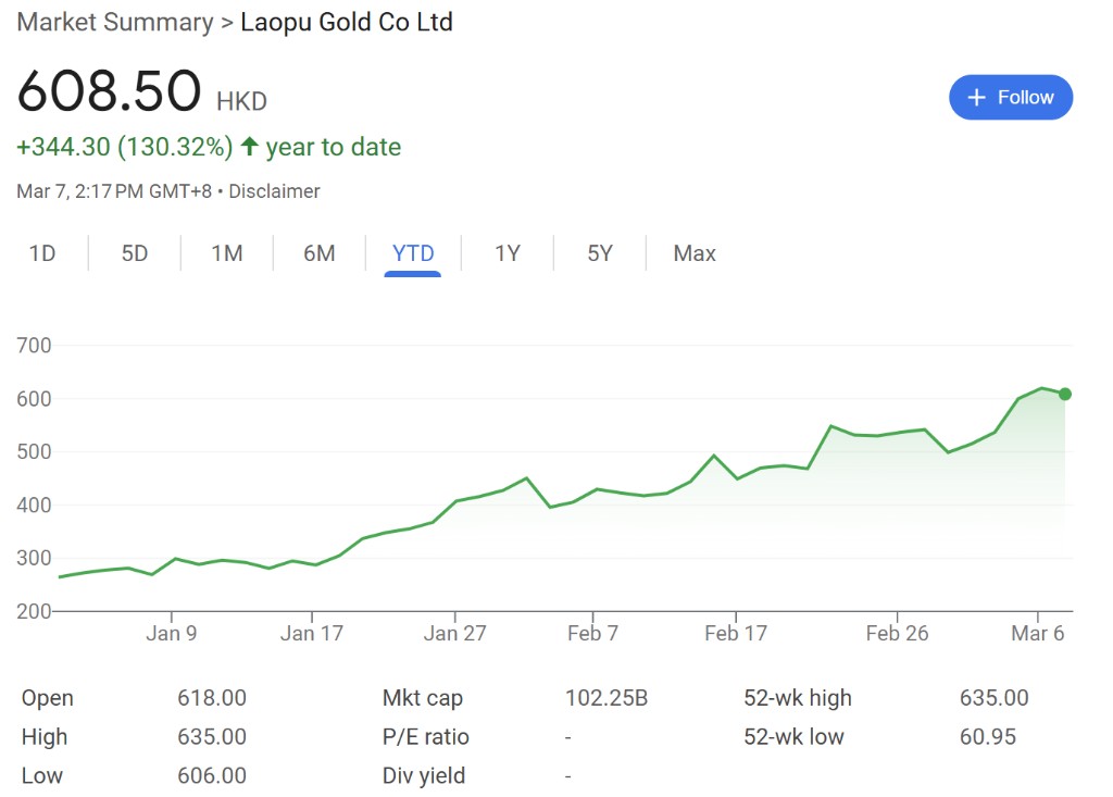 截止發稿,老鋪黃金港股報 608 港元/股,今年以來已經上漲超過 130%。