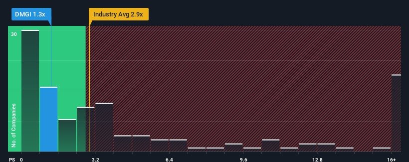 在價格大幅下跌後,DMG Blockchain Solutions 目前可能發出了看漲信號,其市銷率("P/S")為 1.3 倍,因為在加拿大的軟件行業中,幾乎一半的公司市銷率超過 2.7 倍,甚至市銷率超過 9 倍的情況也並不罕見。然而,市銷率可能低是有原因的,需要進一步調查以確定其合理性。