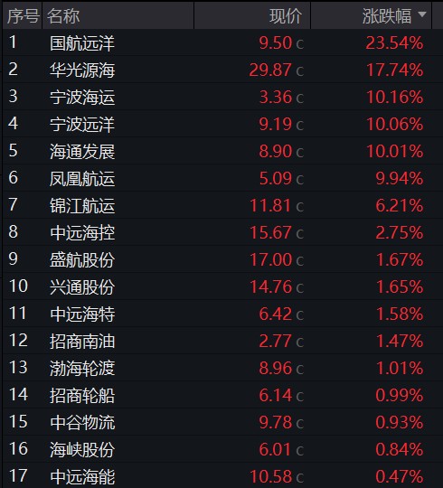 贸易缓和刺激航运板块大涨,周二集运欧线主力合约开盘涨超 10%,A 股、港股港口航运掀涨停潮,国航远洋涨超 23%,宁波海运、宁波远洋、海通发展等海运股涨停,昨晚道琼斯运输指数一度暴涨 6.52%。