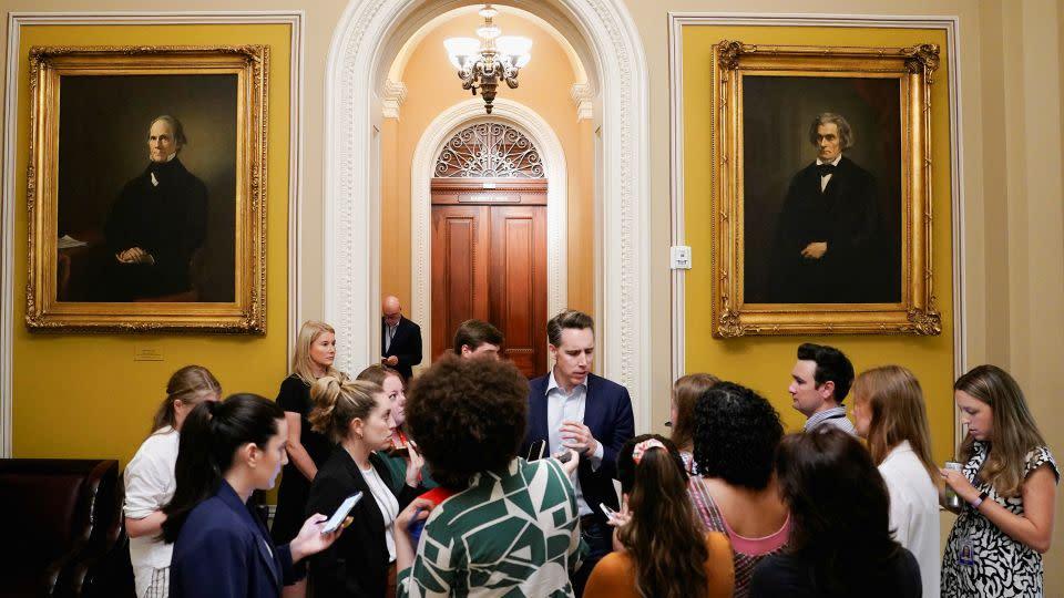 參議員喬什·霍利在國會大廈與記者交談,因共和黨立法者努力通過唐納德·特朗普總統的廣泛支出和税收法案而掙扎,時間是 2025 年 6 月 28 日。 - 肯·塞德諾/路透社