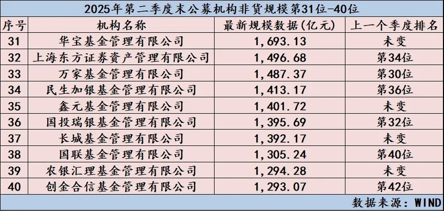 第 31-40 名的公募非貨機構排名依次為:華寶基金、東證資管、萬家基金、民生加銀基金、鑫元基金、國投瑞銀基金、長城基金、國聯基金、農銀匯理基金、創金合信基金。